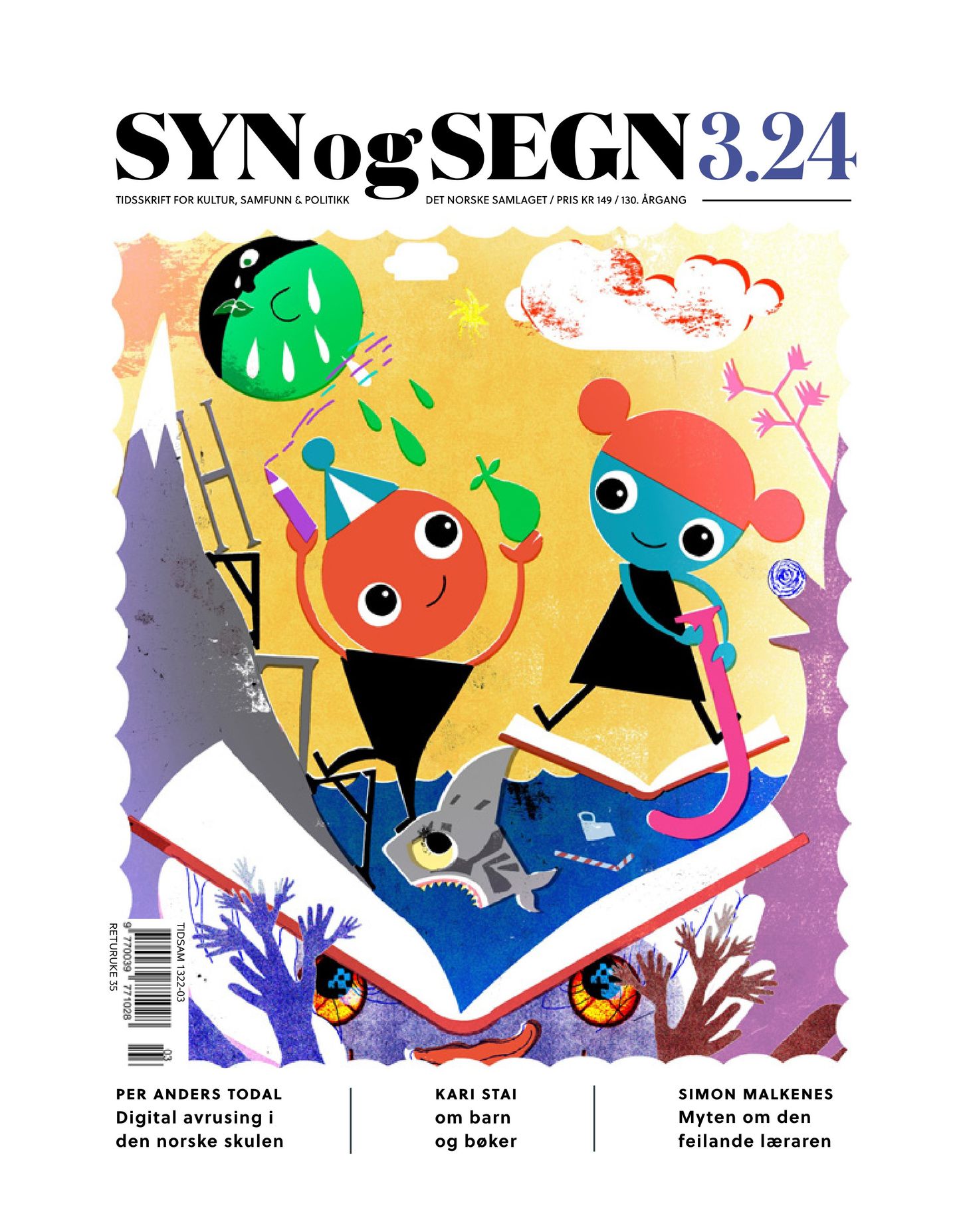 Den nye utgåva av Syn og Segn handlar det om skulen vår. Forfattar og illustratør Kari Stai skriv om barn og lesing. Skuleforskar Peder Haug bidreg med ein artikkel om høge ambisjonar og harde realitetar i skulen. Dag og Tid-journalist Per Anders Todal skriv om kvifor den norske skulen treng ei digital avrusing. Forfattar og lektor Simon Malkenes forklarer korleis den internasjonale studien Pisa fekk ei så dominerande rolle i norsk skulepolitikk og om kva det har ført til. Per Emil Skjelbred er opptatt av gutar og jenter og av korleis skulen kan bli meir praktisk. Kritikar Merete Røsvik skriv om filmen Lærerværelset og om lærarrolla. Den palestiske poeten Somaya Elsousi måtte flykte frå Gaza. No lever ho i Noreg og følgjer med på krigen gjennom telefonen. Heile tida ventande på livsteikn frå barn og barnebarn og resten av den store familien. I tillegg skriv Pål Mykkeltveit om Lars Roar Langslet og konservatisme i Noreg, Ivar Dale om Samarkand og byen Andijan, Bernt Hagtvet har skrive om Berge Furre og kommunismens historie, Sverre Tusvik om Samlaget og Helene Larsen, som har vore elev på Samlaget og Minotenks skule for skrivande med minoritetserfaring har skrive ein dramatatekst.
