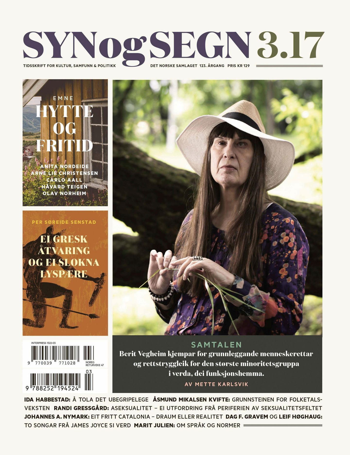 Stor samtale om funksjonshemmingar og menneskerettar med Berit Vegheim, temaartiklar om hyttekultur og hyttefolk ved ekspertane Carlo Aall, Anita Nordeide, Olav Norheim, Arne Lie Christensen og Håvard Teigen. Ida Habbestad har snakka med presten Merete Thomassen om katolisisme, protestantisme og kva dei kan lære av kvarandre.